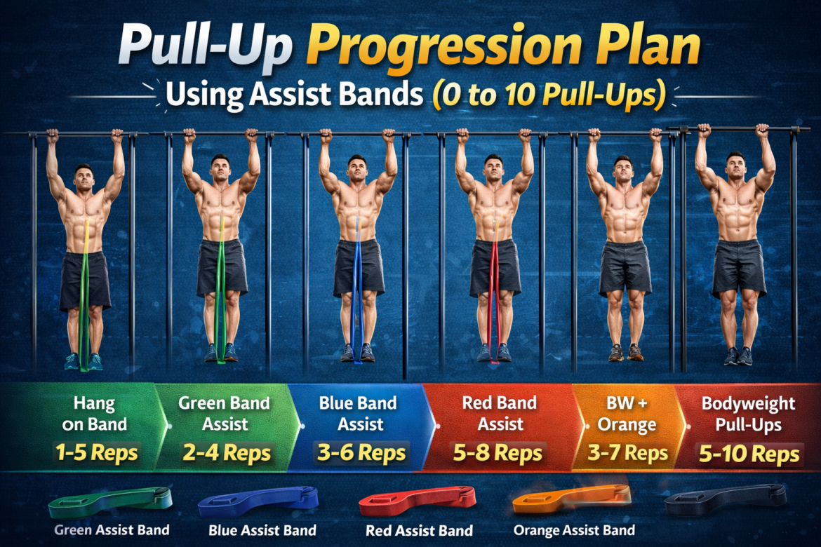 A structured pull-up progression plan using assist bands allows you to safely build strength, improve technique, and gradually achieve 10 unassisted pull-ups. By learning to pull up resist controlled tension, you develop the upper-body strength and confidence needed for long-term pull-up success.